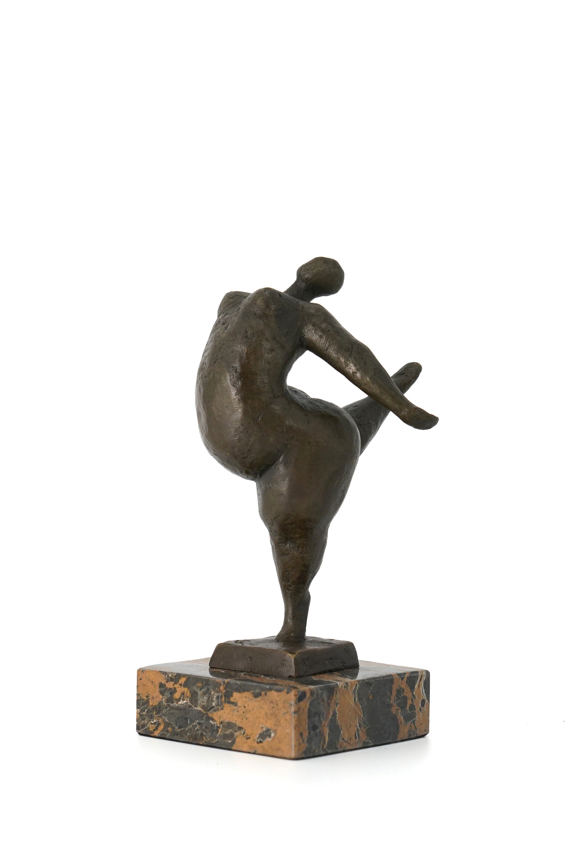 This abstract bronze sculpture captures a powerful moment of motion and balance through the human form. The figure appears suspended in a dynamic pose—one leg grounded, the body twisting upward, arms and limbs extending with expressive freedom.